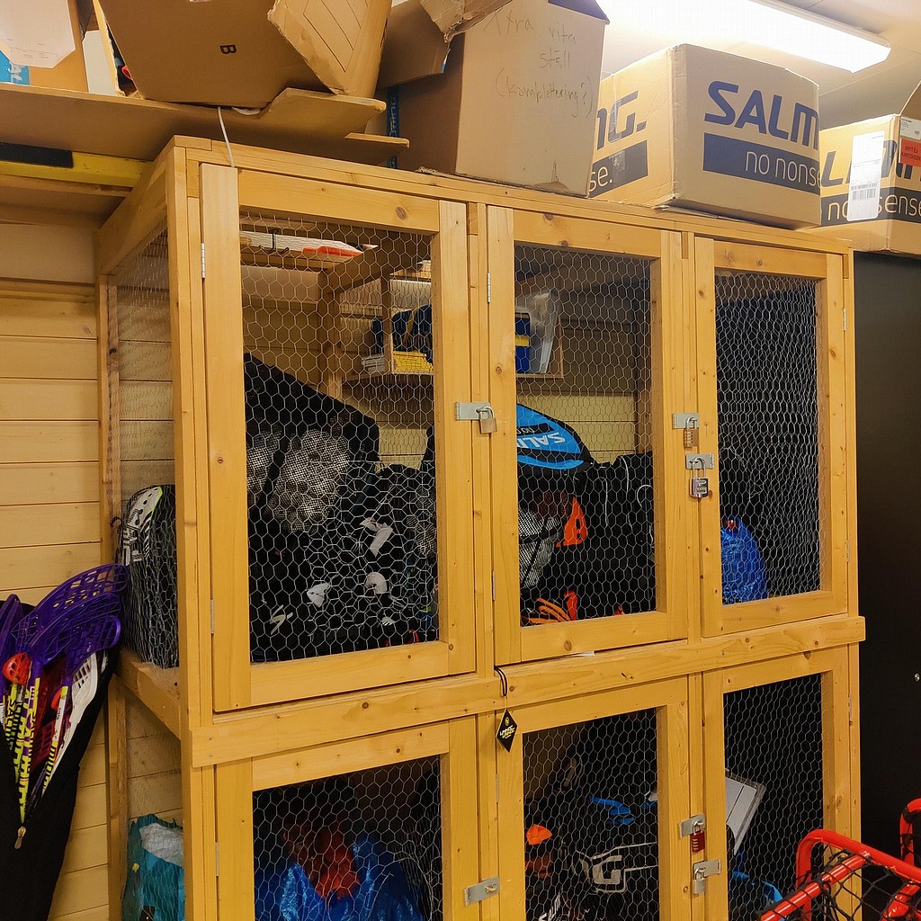 Är det så att ni har några skador på era burar så finns nätrullen (hönsnät) kvar i förrådet. Ligger på hyllan över skåpen på bild.